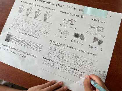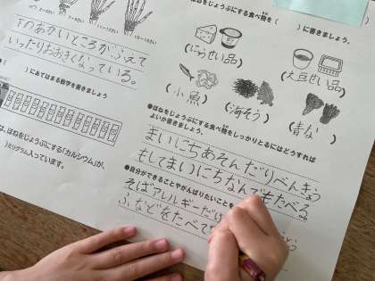 今日の栄養学習では、「ほねをじょうぶにする食べ物について考えよう」というテーマでした。成長と共に骨が変わっていくこと、牛乳には骨を強くするカルシウムがたくさん含まれていること、骨を丈夫にする食べ物について教えていただきました。