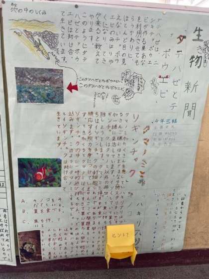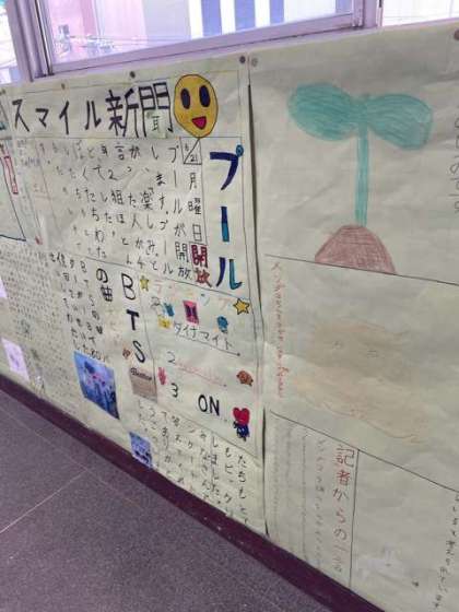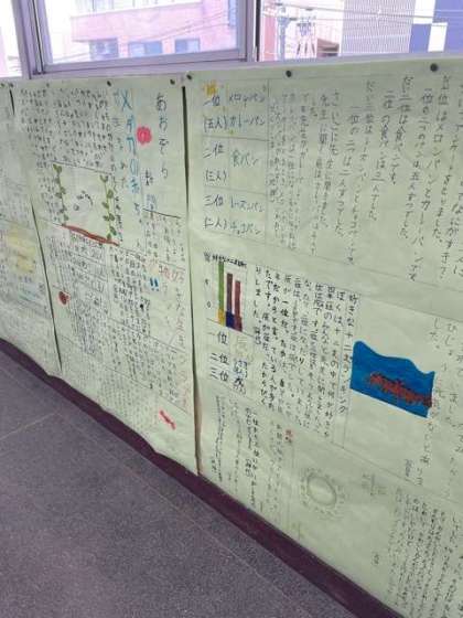 4年生の教室前廊下の壁に、子ども達の新聞が貼ってあります。それぞれ、とても楽しいテーマで、詳しく調べた内容を見やすく工夫をしてかかれています。