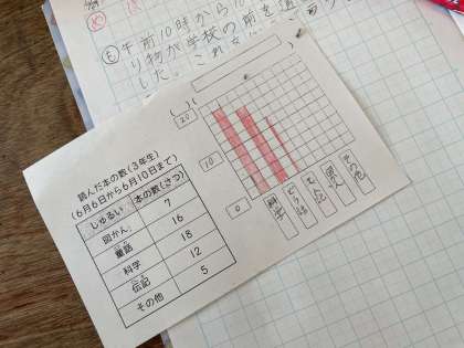 ぼうグラフの書き方について学習しました。1めもりの考え方、グラフの書き方など、しっかりと学んでいます。