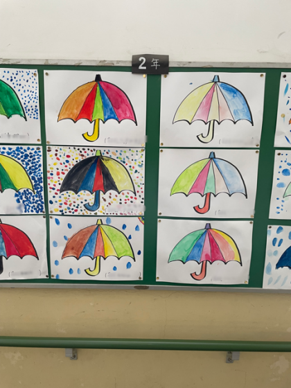 絵の具を使って、色の組み合わせを考えながら、丁寧にぬることができました。こんな傘があったら雨の日も少し楽しくなりそうですね。