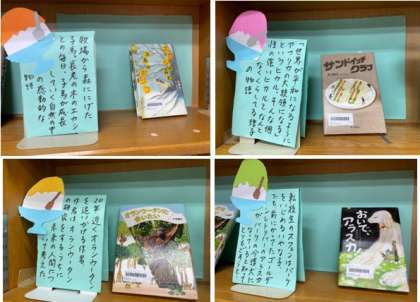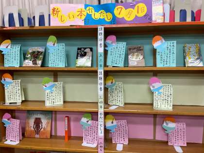 図書室の本棚に新しい本が紹介されています。一冊一冊、どのような本なのかわかりやすく紹介されています。もうすぐ夏休みです。たくさんの本を手にとり、さまざまな教養を身につけてほしいです!