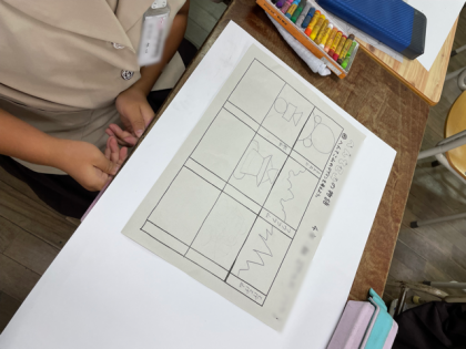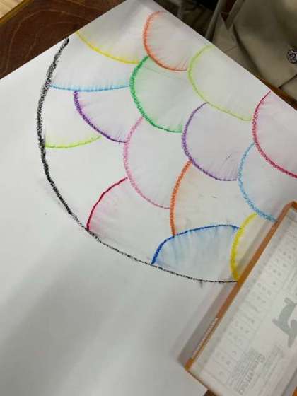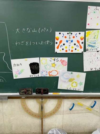 スパッタリングやドリッピング、吹き流しなど色々な技法を使って想像を膨らませてへんてこ山を描いています。面白い山がたくさん!完成が楽しみです!!