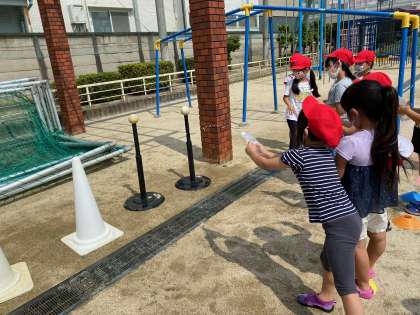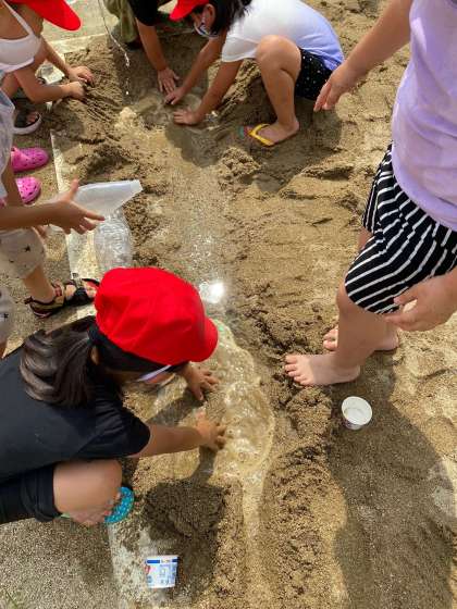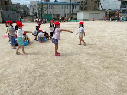 砂や泥にふれ、泥団子を作ったり、川を作ったりしました。また、大きなシャボン玉作りに挑戦したり、水鉄砲で遠くに飛ばしたりしました。
