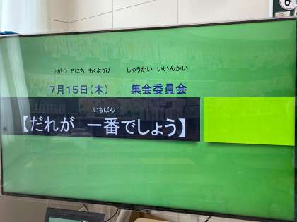 1学期最後の児童集会がありました。いろいろな競技を行う3人で誰が一番になるかを予想していました。1学期はすべてリモートでの児童集会でしたが、十分に楽しむことができたのではないかと思います。