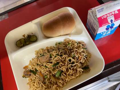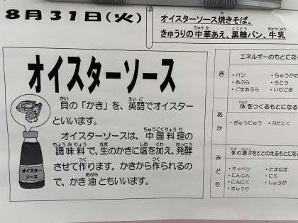 オイスターソース味の中華風の焼きそばです。ニラが入っています。夏休み明けに、ちょうど食べやすい献立です。