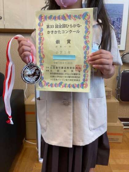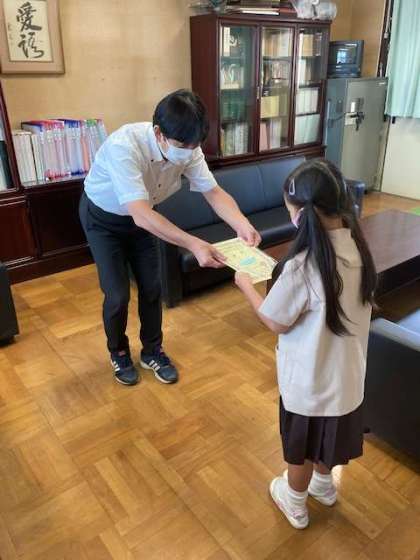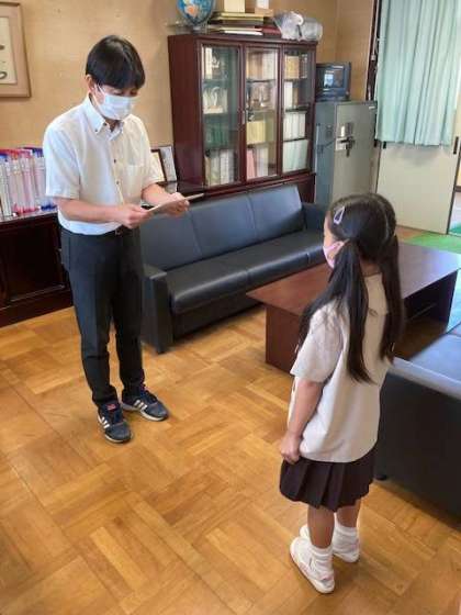 書写のコンクールにおいて、1年生の児童が賞をいただきました。放送での朝会でしたが、全校児童に紹介しました。全校児童で、おめでとうの言葉とおおきな拍手でお祝いしました。その後、校長室で改めて手渡しました。あわせて、1学期の5月に実施した、5年生の「すくすくテスト」、6年生の「すくすくテスト」と「全国学力学習状況調査」の結果をお知らせしました。「すくすくテスト」では一部、大阪府の平均に届かなかった教科はありましたが、5年生・6年生ともに大阪府の平均を超えるすばらしい結果でした。特に、6年生の「全国学力学習状況調査」では、全国平均を上回るすばらしい結果でした。得意不得意はあっても、ひとりひとりが諦めることなく最後までしっかり取り組んだ成果だということを称賛しました。