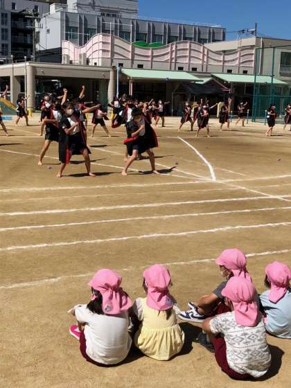 運動会へ向けて、これまで練習してきた頑張りを、幼稚園の園児さんたちに見てもらいました。