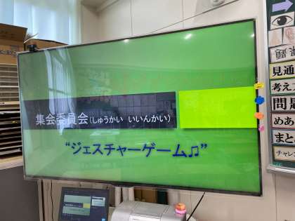 今日の児童集会は「ジェスチャーゲーム」でした。集会委員会の児童がいろいろな動きをして、それをあてるものでした。集会委員会の児童の動きがとても分かりやすかったので、全員何の動きをしているかすぐに分かっていました!