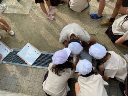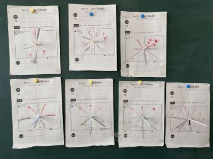 時間ごとに、太陽の位置とかげの向きの観察を行いました。かげの向きの変化とともに、太陽の向きも変わっていることに気づくことができました。とても楽しそうにかげを写しとっていました!