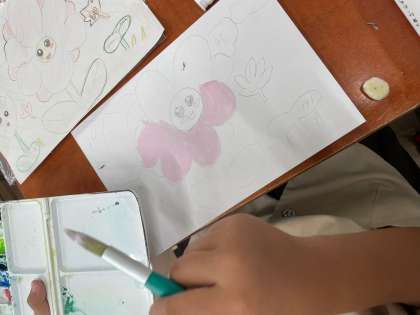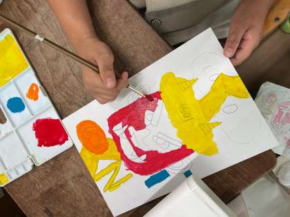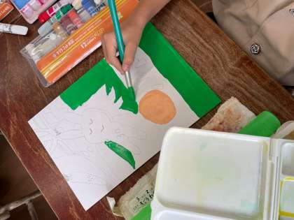 図画工作科でコリントゲームの板に色をつけています。一人一人工夫しながら、色を塗っていました。完成が楽しみですね!