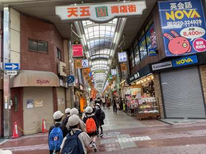 天神橋筋商店街も見学しました。たくさんのいろいろなお店に子どもたちも大興奮。お店の数を数えている児童もいました。新しい発見があったかな〜