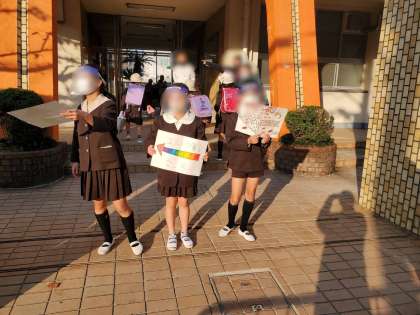 計画委員が講堂の前と門の前に立って