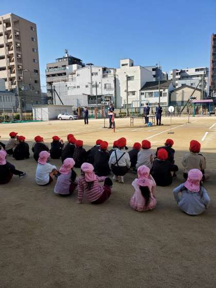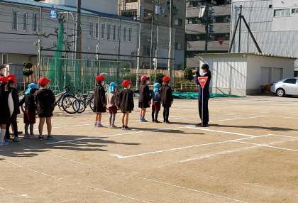 1年生のお兄さん、お姉さんと一緒に大阪府警察による交通安全指導を受けました。