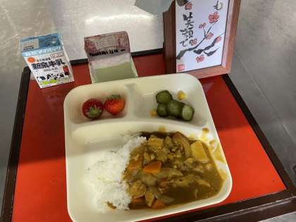 「チキンレバーカレーライス」は、不足しがちな鉄を補うことを目的に、開発された新食品の鶏レバーペーストを使用しています。みじん切りのしょうがで鶏レバーの臭みをおさえています。初めての献立でしたが児童も喜んで食べていました。