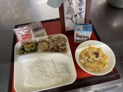 「菜の花のおひたし」は、一年でこの時期だけ味わうことのできる菜の花を、だしをきかせたしょう油味の調味液であえ、小袋のかつお節をかけていただきます。白菜を組み合わせることで、菜の花の苦みをおさえ食べやすくなっています。