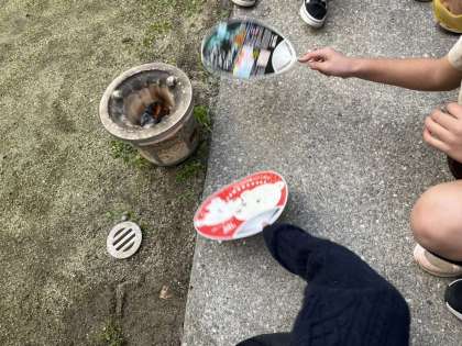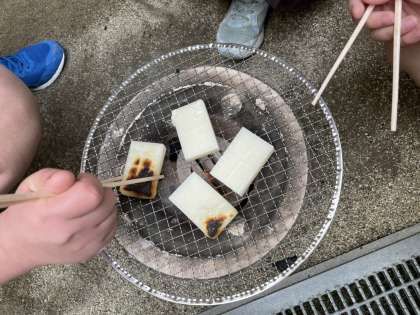 3年生が昔の道具を学ぶにあたり、七輪体験を行いました。はじめはうちわであおいでも、なかなか火が起きず大苦戦でした。徐々に火力が強くなり、子どもたちはとても喜んでいました。おもちもおいしく焼けて、しょうゆ、きなこで食べました!