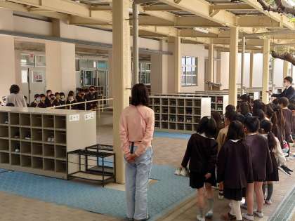 下足箱では、1年生と2年生の子どもたちがバッタリ!