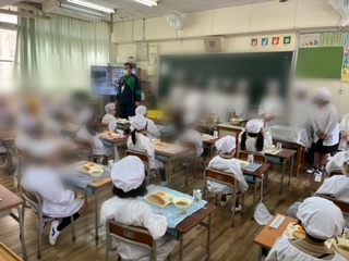 6年生は本日から1週間、1年生の給食の配膳を手伝います。1年生に食器の置く場所やストローの差し方など、優しく教えることができました。