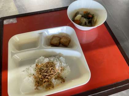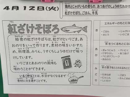 紅ざけそぼろは、紅ざけといりごま、あおのりをいったものをごはんにふりかけて食べます。児童もとてもおいしそうに食べていました!