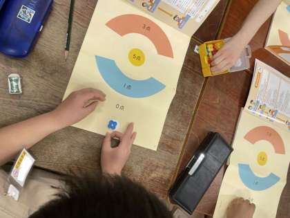 おはじきをとばして、合計の点数がいくつかを求める学習をしています。0点のところは、いくつ入っても0点であるということに気づくことができました。