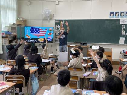 今年度から初めての教わるC-NETの先生との外国語活動。楽しく先生の自己紹介を聞いていました。英語の発音をしたり、先生に質問したりしました。