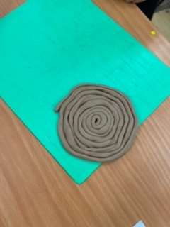 図画工作科の学習でねんどをしました。今日はねんどを『なが〜く』のばし、ひもひもねんどを作りました。両手で上手にのばす様子が見られ、ねんど板からはみ出るほどでした。のばしたものは、うずまきを作って、「うずまきパンみたいだね!」という声も聞こえました。1年生になって初めてのねんどに、多くの笑顔が見られました。