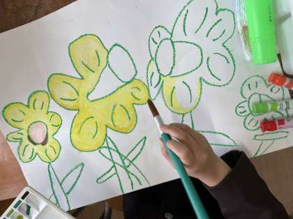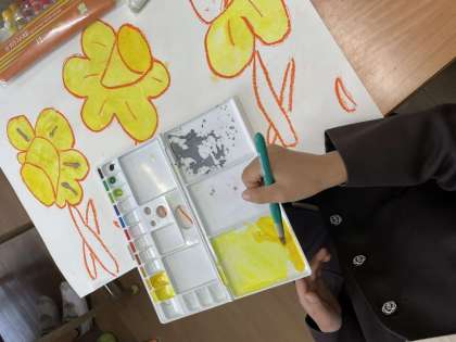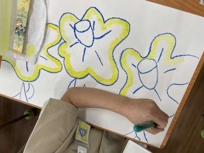 パスで描いたすいせんに絵の具で色をつけはじめました。花や草の色を自分なりに考えて、丁寧に塗ることができました。