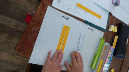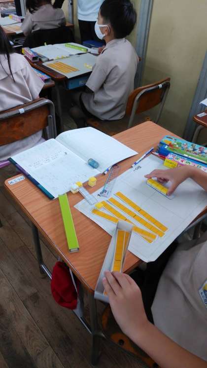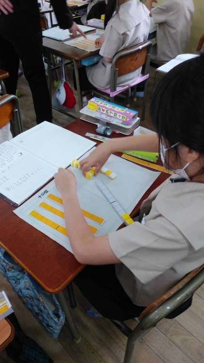 算数の授業で、ひきざんや長さの学習をています。ひきざんでは、ブロックを使ってしっかり考えることができました。
