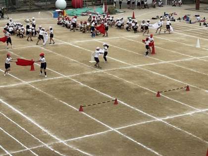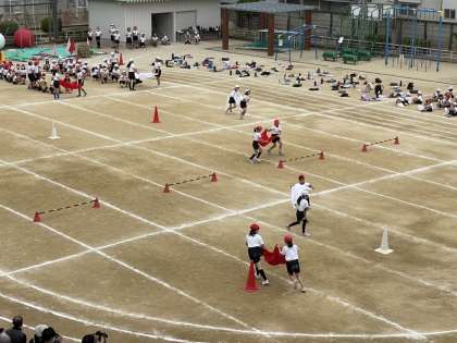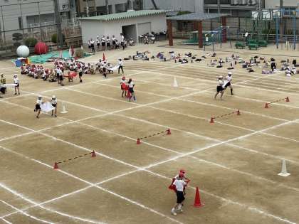 5年生による「フライシートリレー〜落とすなよ、落とすなよ〜」です。ボールを落とさずに、上手に運ぶことができました。