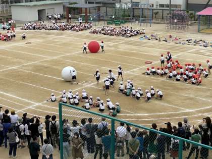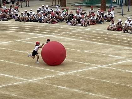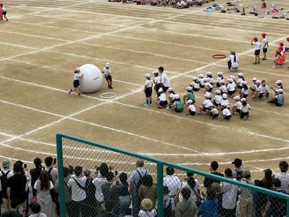2年生による「トライ!!大玉ころがし」です。大きな大玉を一生懸命転がす姿、とてもかっこよかったです!