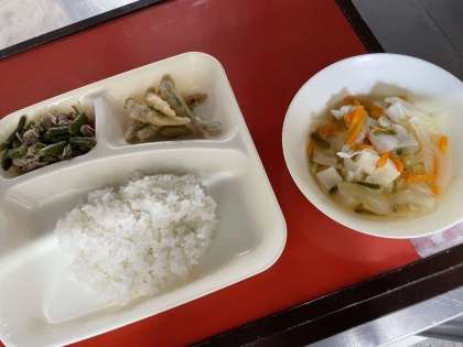 「いわしてんぷら」は油で揚げ、砂糖、みりん、米酢、こいくちしょうゆで作ったタレをかけます。「五目汁」はとうふ、キャベツ、たまねぎ、にんじん、青ねぎを使用しています。「豚肉とさんどまめのいためもの」は豚肉とさんどまめをいため、塩、こいくちしょうゆで味付けします。