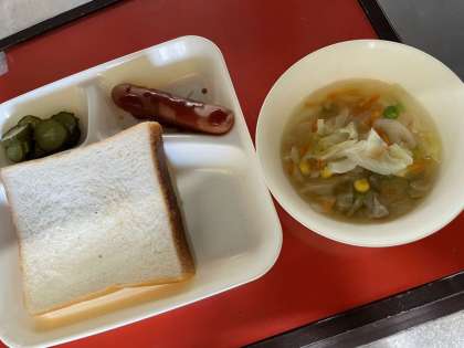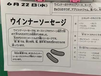 「ウインナーのケチャップソース」は、ウインナーソーセージに砂糖、ケチャップ、トンカツソース、ウスターソースを合わせて煮、でん粉でとろみをつけたソースをかけます。小麦アレルギーの児童生徒も食べることができるように今回より、デミグラスソースを使用していません。