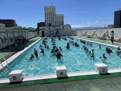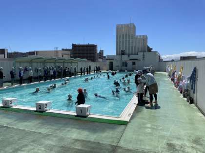 晴天の中、着衣水泳を実施しました。急な災害などに巻き込まれた場合、どのように行動すればよいか考えながら取り組みました。「泳ぎにくい!!」とたくさんの児童が口にしていました。