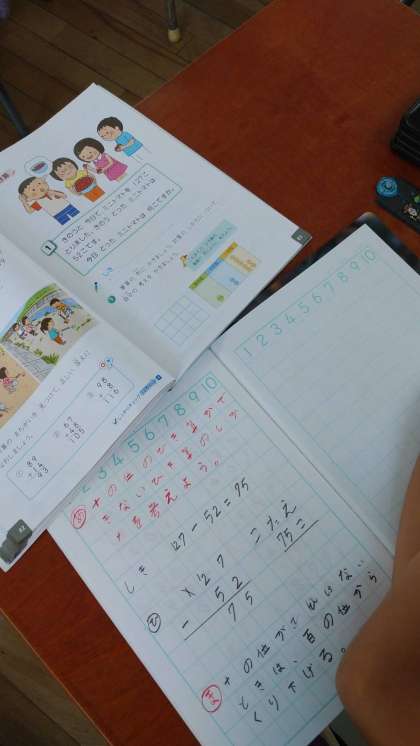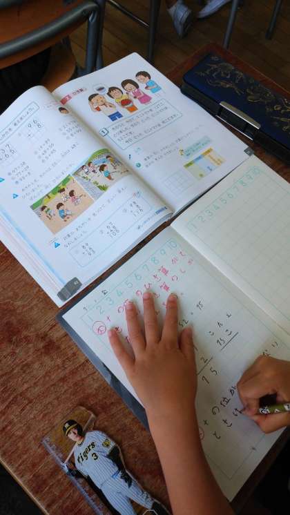 算数で筆算の学習をしています。位をそろえて、ミスをしないように気をつけて計算をしています。ノートもとても丁寧に書くことができるようになっています。すてきですね!