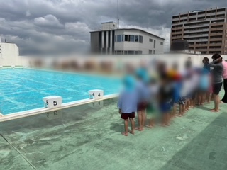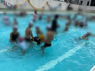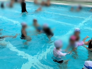 本日、6年生と幼稚園のきりん組と一緒にプールに入りました。お兄さんやお姉さんに泳ぎ方を教えてもらいながら、楽しく泳ぐことができました。6年生はお礼を言われて照れていました。