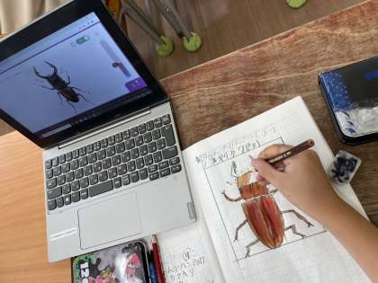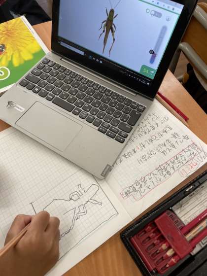 理科でこん虫について学習しています。「ものすごい図鑑」を使って、いろいろな昆虫の体のつくりについて観察しています。