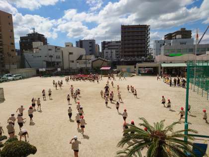 地震発生時は頭を守り、揺れがおさまると運動場に避難します。