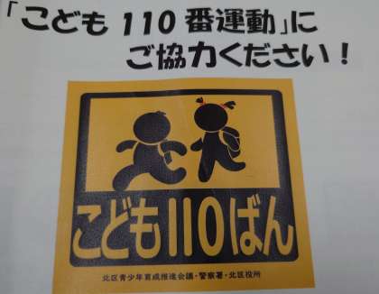 北区にある家・自転車などについているのを見かけたことがある人もいるのではないでしょうか。何か危険を感じたときは、このマークがついている家や人に助けを求めてください。地域の方が、みんなを守ってくれるからね。