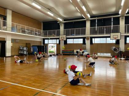 ボール投げ運動の一つとして、床に寝て、ボールを上に投げる「スナップスロー」の練習をしました。やってみると、意外と難しそうにしていました。ご家庭でもぜひ、チャレンジしてみてください。