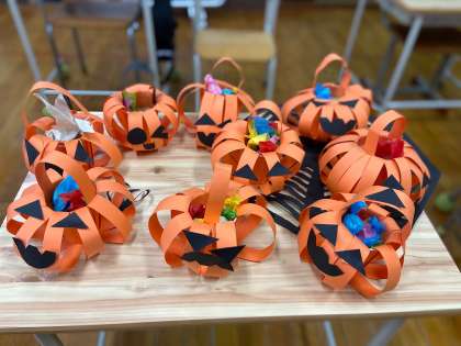 「怖いかぼちゃにする!」「かわいいかぼちゃにする!」と楽しんで工作していました。