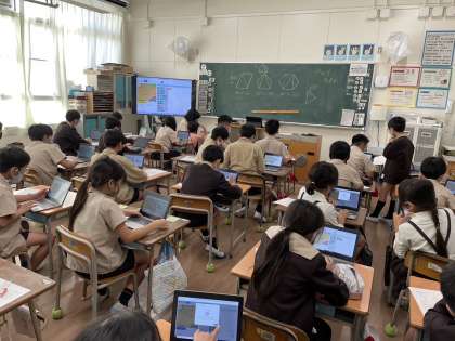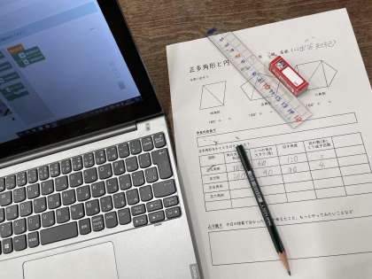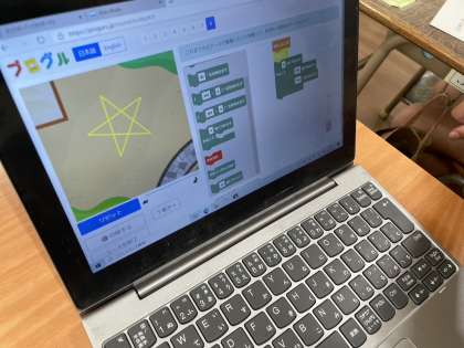 クラブ活動の様子です。多角形のかく方法を考えて、プログラムしていきます。少し難しそうでしたが・・・しっかり考えて取り組むことができました。