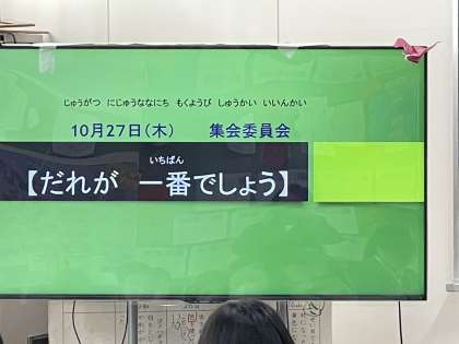 10月27日、児童集会では「だれが一番でしょう」ゲームがありました。だれが一番になるか予想しながら、楽しく見ることができました。