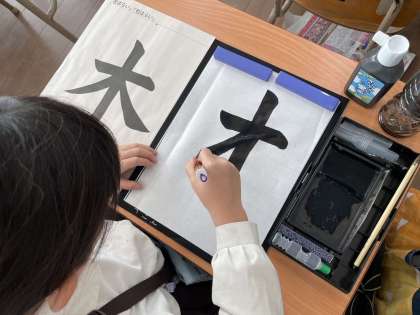 毛筆の学習です。右はらいに気をつけて、「木」という字を書きました。集中して取り組めるようになってきました。