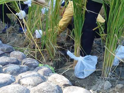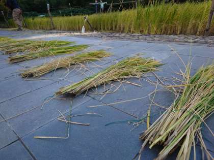 「食育」として年間を通じて、田植え、水草取り、収穫「稲刈り」、脱穀、そして調理実習で食べる!