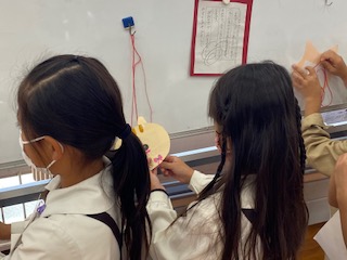 生活科の学習で2年生が廃材を使っておもちゃを作りました。牛乳パックで作ったパッチンがえるや、はこやペットボトルなどで作った車など、たくさんのおもちゃを作りました。