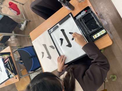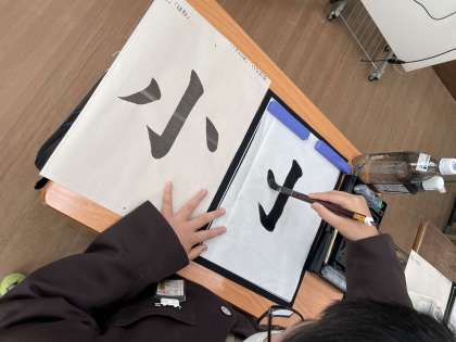 毛筆の学習の様子です。落ち着いて書けるようになってきました。今日は「はね」に気をつけて、丁寧に書くことができました!