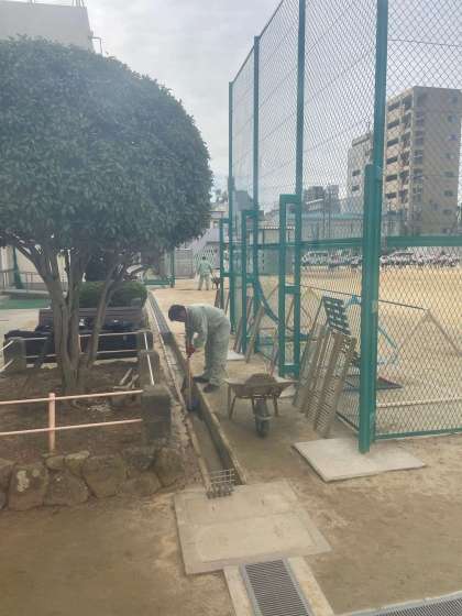 管理作業員さんが、運動場の溝の掃除や土運びをしてくださっています。