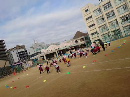 小学校の運動場で幼稚園の園児たちが遊んでいます。