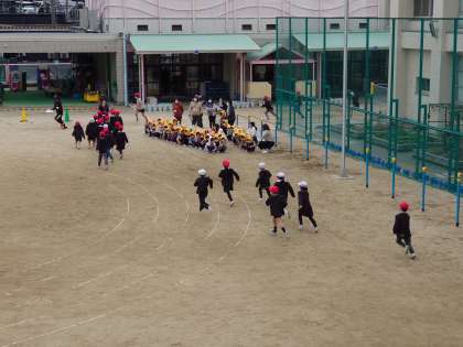 休み時間の発生を想定した訓練のため、運動場で遊んでいる人は教室に戻らず、運動場で待機します。