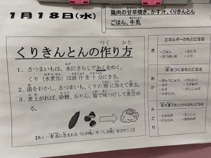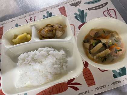 「かす汁」は、年に1回だけ登場する汁ものです。さけ、つきこんにゃく、うすあげ、だいこん、にんじん、青みに青ねぎを使用し、うすくちしょうゆ、みそ、酒かすで味つけした寒い時期に体が温まる具だくさんの汁ものです。